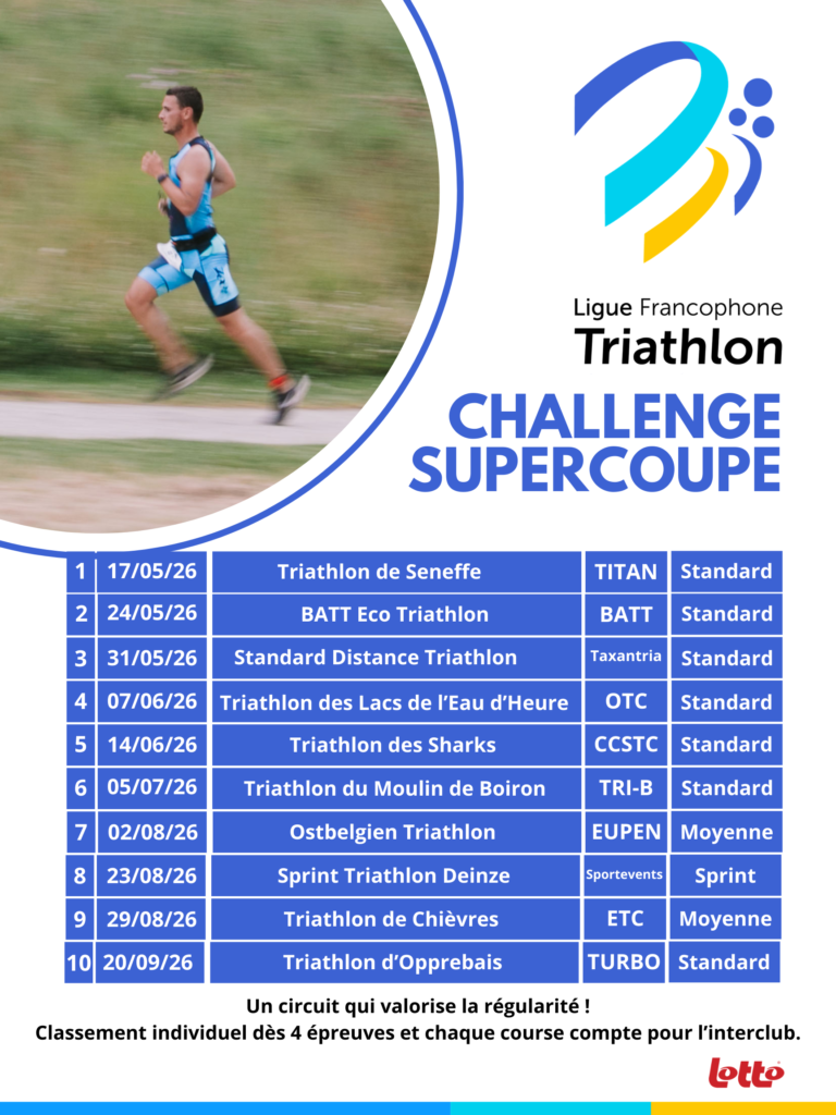 Le Challenge Supercoupe reprend des compétitions de format sprint, distance standard et moyenne distance. Il existe cependant bon nombre de variantes, et notre calendrier propose des formats de triathlons permettant à chacun de trouver un intérêt et un défi à sa mesure. Que vous soyez débutant ou expérimenté, que vous ayez envie de prendre part à une compétition ou simplement de découvrir la natation, le cyclisme et la course à pied, il y a forcément un format qui vous conviendra.